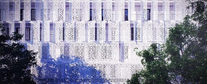 這些都是室外沖孔板的運(yùn)用,結(jié)合rhino grasshopper的參數(shù)化處理,讓原本平平無奇的鋁單板美的淋漓盡致。同樣這樣的設(shè)計(jì)放在室內(nèi)也可以的,不論是展示墻的設(shè)計(jì)還是吊頂,外立面,這都會(huì)是一款讓設(shè)計(jì)師瘋狂的材料。
