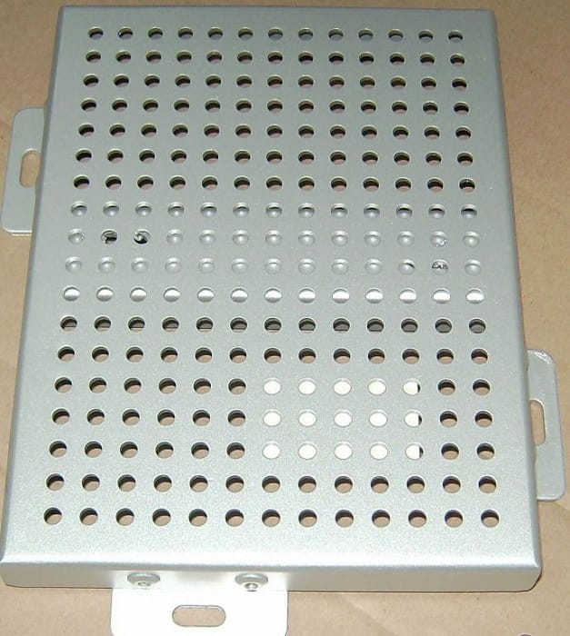 1、鋁單板主要選用1100系列鋁合金板材經(jīng)過折彎成型、焊接、背面加槽型加強(qiáng)肋,四周鉚接角碼組成。